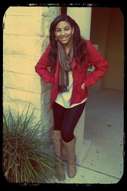 This outfit is from yesterday. I couldn't post yesterday, super busy (sorry guys)! But it was a casual and finally colder day (cold for Texas, 59-ish degrees). I am a strong believer in leggings, they are flattering to most sizes and super comfy, yet warm. But leggings are NOT pants! They look great under a loose top, pretty dress, or a long cardigan. The only time leggings can be accepted as a pant, is at the gym with a fairly loose t-shirt. Yesterday I wore a loose, poetry type of top with leggings, my favorite winter jacket and favorite boots. Remember that winter outfits are about being stylish and warm (lets be practical ladies and not end up with the flu). I don't think nike shorts and a hoodie is an acceptable winter choice for being on-campus going from one building to another. Be smart and gorgeous darlings.